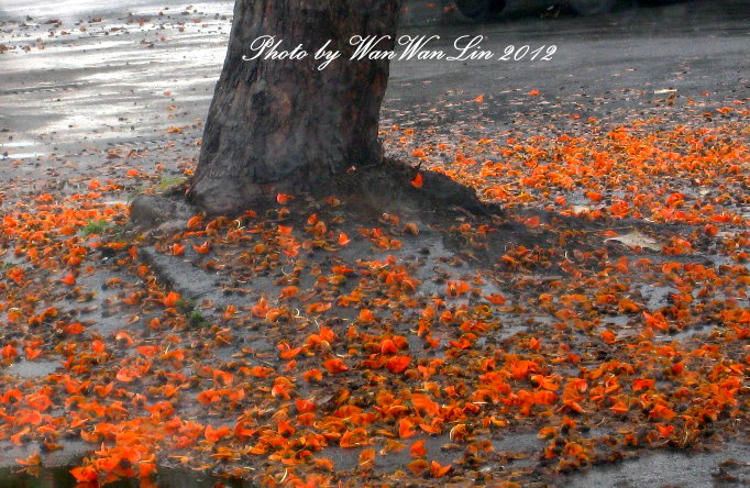 花兒掉落一地,與路旁綠地輝映,更惹人注目。